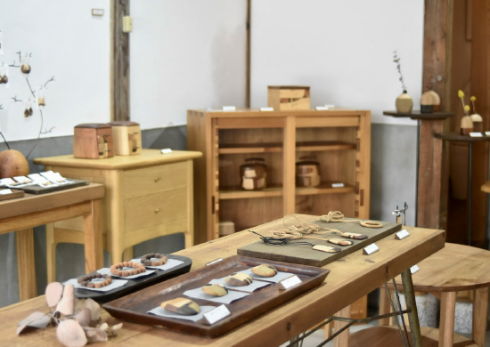 ほっと一息つけるひと時、木を主とするフジタマリの作品、それらを楽しんでいただく空間。