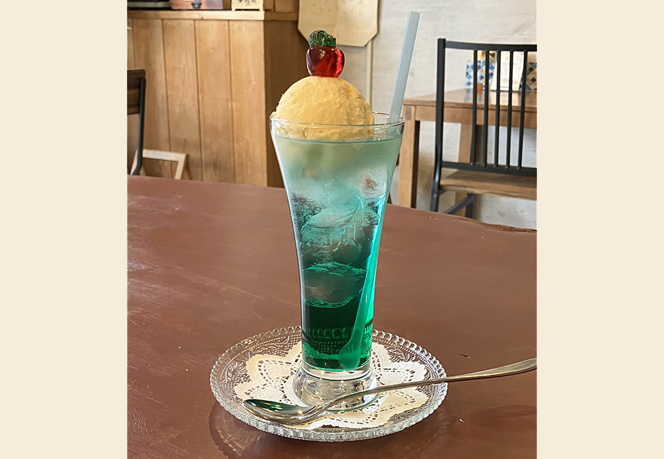 季節を問わずオープン当初から人気の押し色クリームソーダ 懐かしい味わい(色によって風味が違います)推しと一緒に写真を撮ったりして楽しめます。